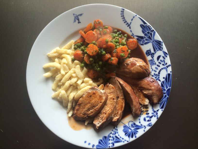 Hähnchenbrust in Rotweinsoße mit Spätzle und Gemüse