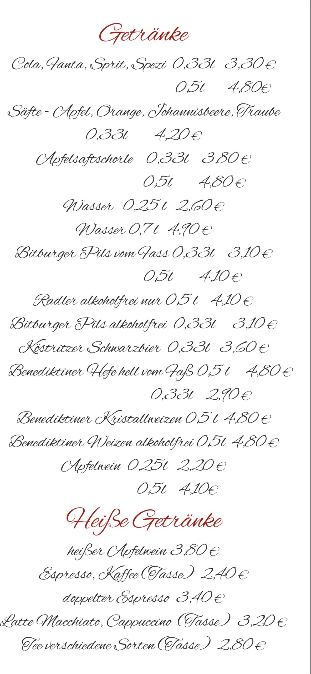 Vorspeisen und Hauptgänge aktuell. Weitere Gerichte sind vielmals noch auf der Tafel im Lokal zu finden.